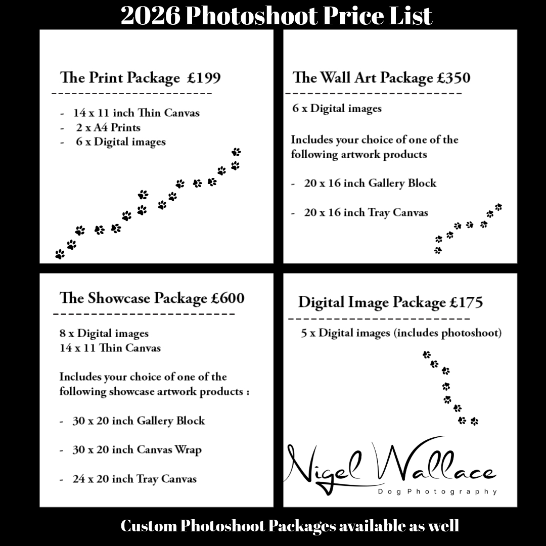 Booking is easy! Either fill out the form below or give me a call on 07720 834868 . We will have a pre-shoot consultation to discuss your pet, the best location, and what you would like from the shoot. On the day, the photoshoot will be very relaxed with no time limit. I will capture a range of photos including portrait and dynamic action shots (of course, this depends on what you and your dog are comfortable with; the safety and well being of your pet is paramount). Following the shoot, I will present you with a stunning gallery of the edited images. From this, you will be able to select your chosen photos, and view the various wall art options available to best display your images.